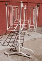 Cuna de hierro forjado de forma rectangular con ruedecitas.