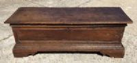 cassone piemontese in legno di noce, incorniciato su fronte e fianchi, piedi sagomati.
