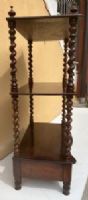 Pequeña librería-estantería-mueble en madera de caoba, con forma contorneada y torneados en las columnas, con un particular cajón portadocumentos en la base y pomos de cerámica