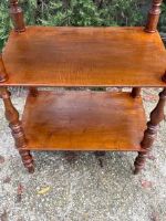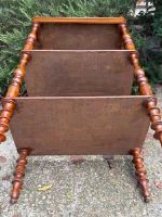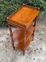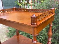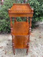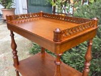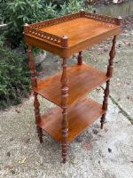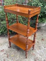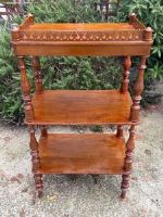 Antica libreria a giorno Etagere tutta in noce piumata a tre piani con castello in legno intagliato e tornito sul piano superiore.