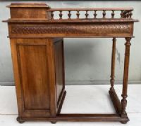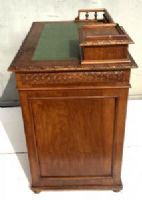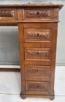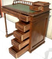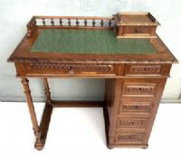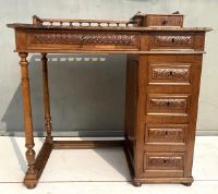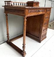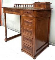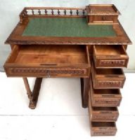 Small Art Nouveau desk in walnut wood, with seven drawers, four of which are lateral and one resting on the top; the top is covered in variegated green dermoid; complete with a chair from the same period, all perfectly restored.