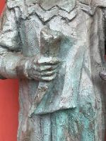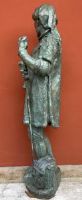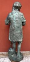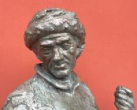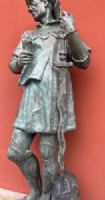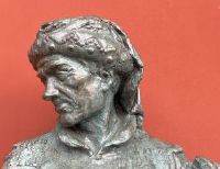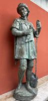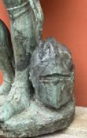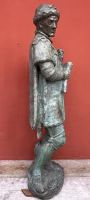 Large plaster sculpture with bronze patina, depicting a medieval historical figure, with sword, scroll, and helmet, likely a knight of fortune.