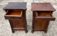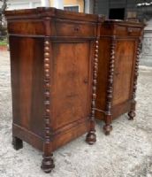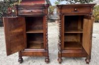 two Lombard bedside tables from the 19th century, in walnut feather (they are very similar, but not identical) with a top with shaped corners, turnings on the sides and shaped feet as well.