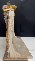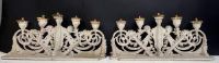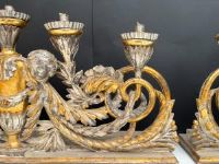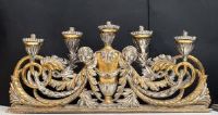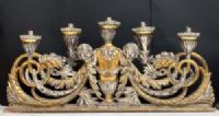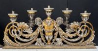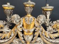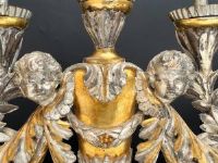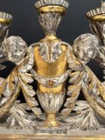rara coppia di grandi candelieri da tavolo in legno scolpito, argentato e dorato, a cinque bracci, in quello centrale, sono visibili un  vaso ad anfora e due testine di putti.