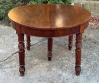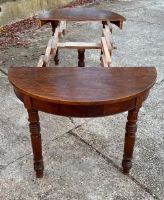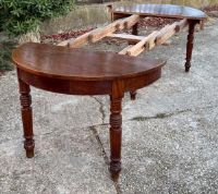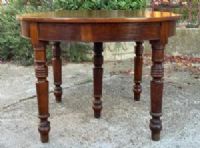 Il tavolo è stato ritirato da un convento nella zona piemontese, ed era utilizzato da chiuso… ( chiuso può essere utilizzato da 4 persone comode) e possibile allungarlo tirando le due mezze lune. Per poterlo utilizzare aperto necessiterebbe di restauro alle guide e della realizzazione di allunghe in legno ( solitamente con una larghezza di cm 40 , cioè ogni allunga aggiunge due posti a sedere ). È possibile inserire fino a 4 allunghe… diventando un 12 posti a sedere.