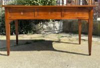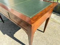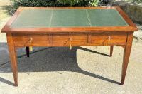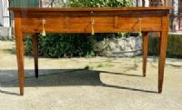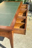 Veramente importante questa stupenda scrivania diplomatica da centro a tre cassetti con pianetto estraibile al centro, tutta in noce massello ( rigatino) in patina originale. La gamba è piramidale, tipica del periodo fine ‘700 italiano…. Particolare da notare è la strozzatura a cipolla al fondo gamba, molto elegante. La scrivania è da centro e la parte posteriore è lo specchio della parte anteriore, simulando altri tre cassetti.