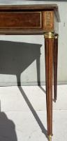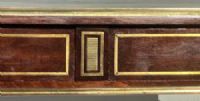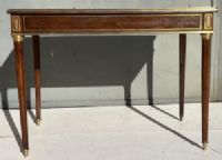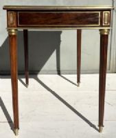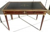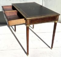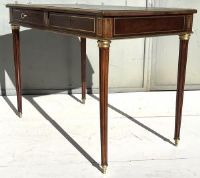 scrittoio in legno di mogano con due cassetti sul fronte, gambe scanalate e scarpette, arricchito da bronzi.