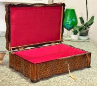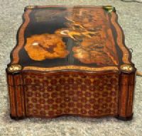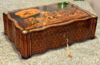 Il grande cofanetto ha un'intarsio a tecnica policromia con diversi tipi e colori di legno avorio e madreperla per creare un'immagine molto dettagliata. I fianchi riportano intarsi con tecnica a marchetteria con disegni geometrici e i quattro scantinati a forma di colonna ottagonale, per imporre la forza.