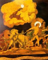Il mito di Fetonte e il carro del sole narra del giovane Fetonte, figlio del dio Sole (Elio), che, per dimostrare la sua nobile discendenza, chiese al padre di guidare il suo carro infuocato per un giorno. Nonostante i tentativi di Elio di dissuaderlo, Fetonte salì sul cocchio ma, essendo inesperto, perse il controllo dei cavalli che iniziarono a volare troppo in alto e troppo in basso, bruciando e congelando la terra. Per fermare il disastro, Zeus fulminò Fetonte, facendolo precipitare nel fiume Eridano (oggi Po).