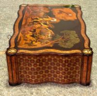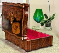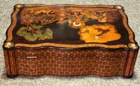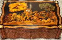 Stupenda e perfetto, grande cofanetto d’epoca Direttorio, che mostra un'intarsio in legno finemente lavorato d’altissima ebanisteria che raffigura una scena mitologica classica, legata al mito greco di Fetonte una narrazione solare.