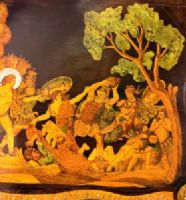 La scena centrale mostra una figura radiosa, probabilmente il dio del sole Elio- Apollo, su un carro trainato da cavalli.